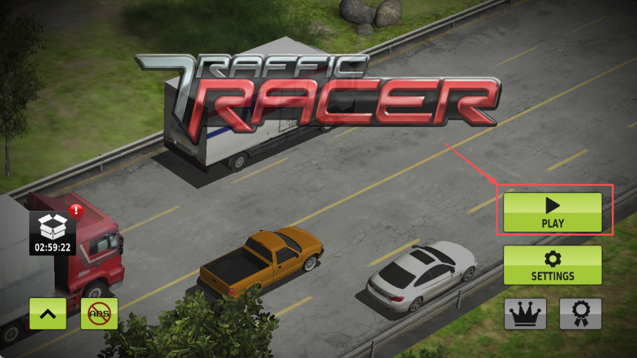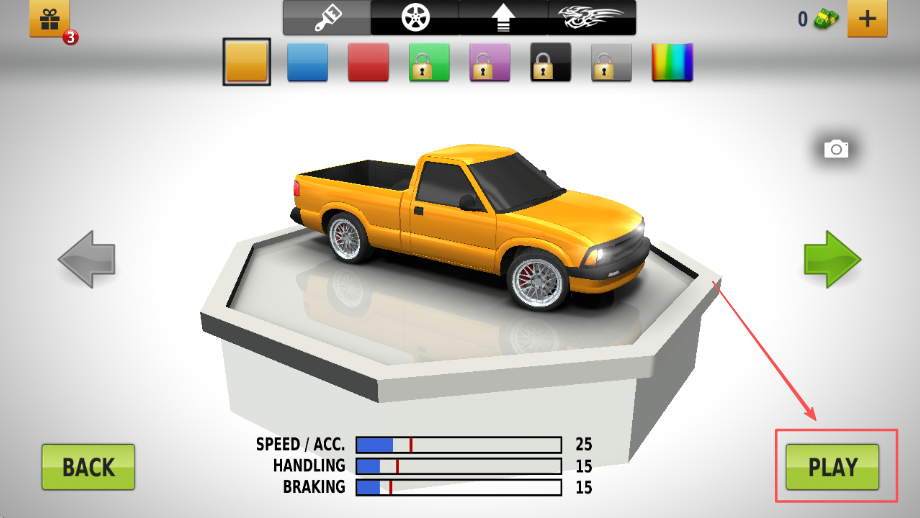 2、接着会进入车库界面,在这里浏览并选择你心仪的酷炫座驾,然后点击旁边绿色的PLAY键确认你的选择。